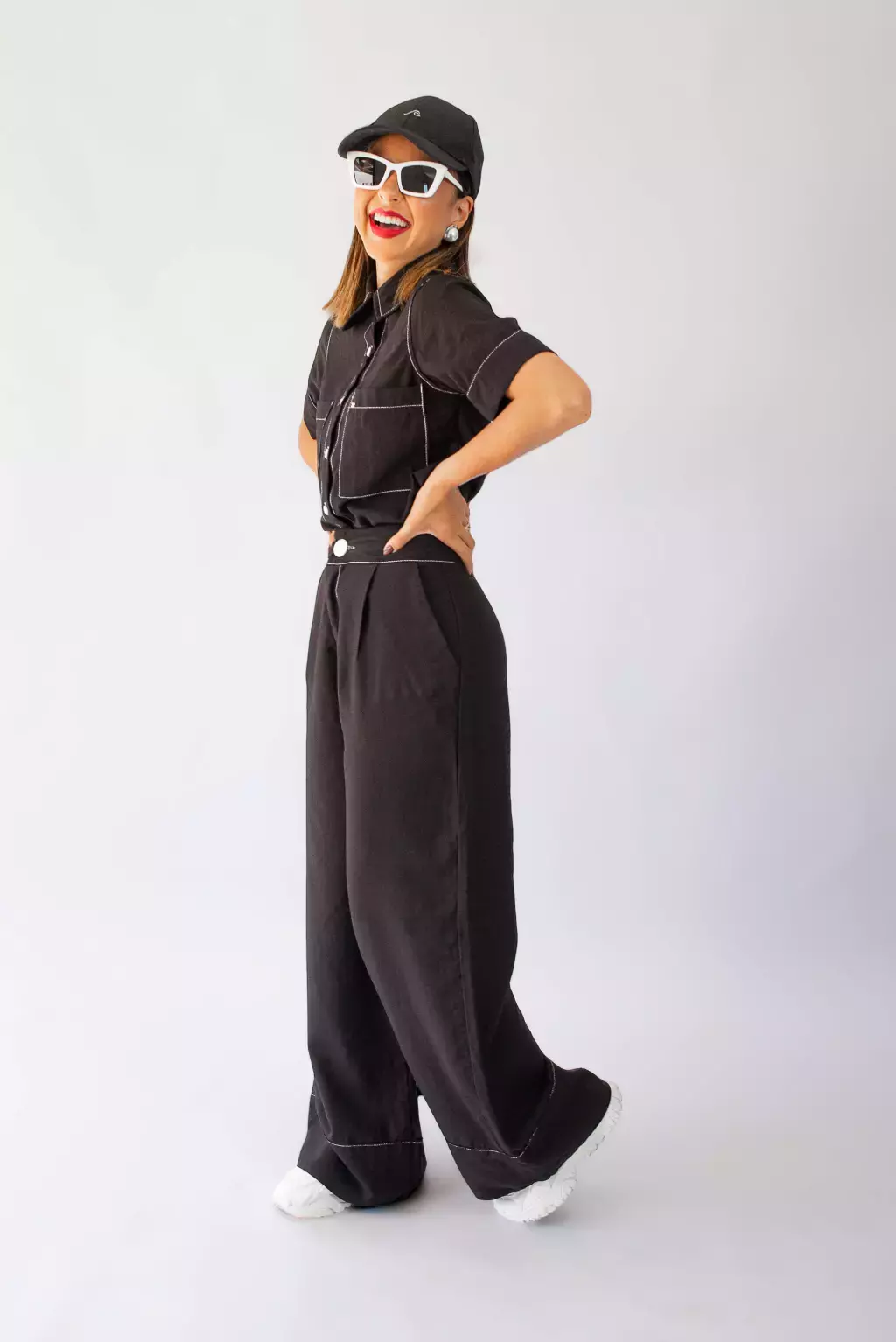 Eleve seu estilo com este conjunto sofisticado e moderno, composto por camisa de manga curta e calça pantalona em tecido leve e confortável. A camisa apresenta gola estruturada, botões brancos contrastantes e dois bolsos frontais com acabamento em pesponto branco, conferindo um toque de elegância e personalidade. A calça pantalona de cintura alta possui botão frontal e pespontos que combinam com a camisa, alongando a silhueta e garantindo movimento fluido. Perfeita para looks urbanos, versáteis e cheios de atitude, esta combinação pode ser usada tanto com tênis para um visual casual quanto com scarpin para ocasiões mais sofisticadas.